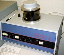 This tool is used to sputter a conductive film (gold or gold/palladium) on samples for SEM analysis and to provide some limited surface clearing in some models. The mounting of a turbo molecular pump to the system enables it to quickly pump the chamber to a high vacuum level. Six main operations are available for the system: vacuum, etch, rotating, sputter, time etch and time sputter.