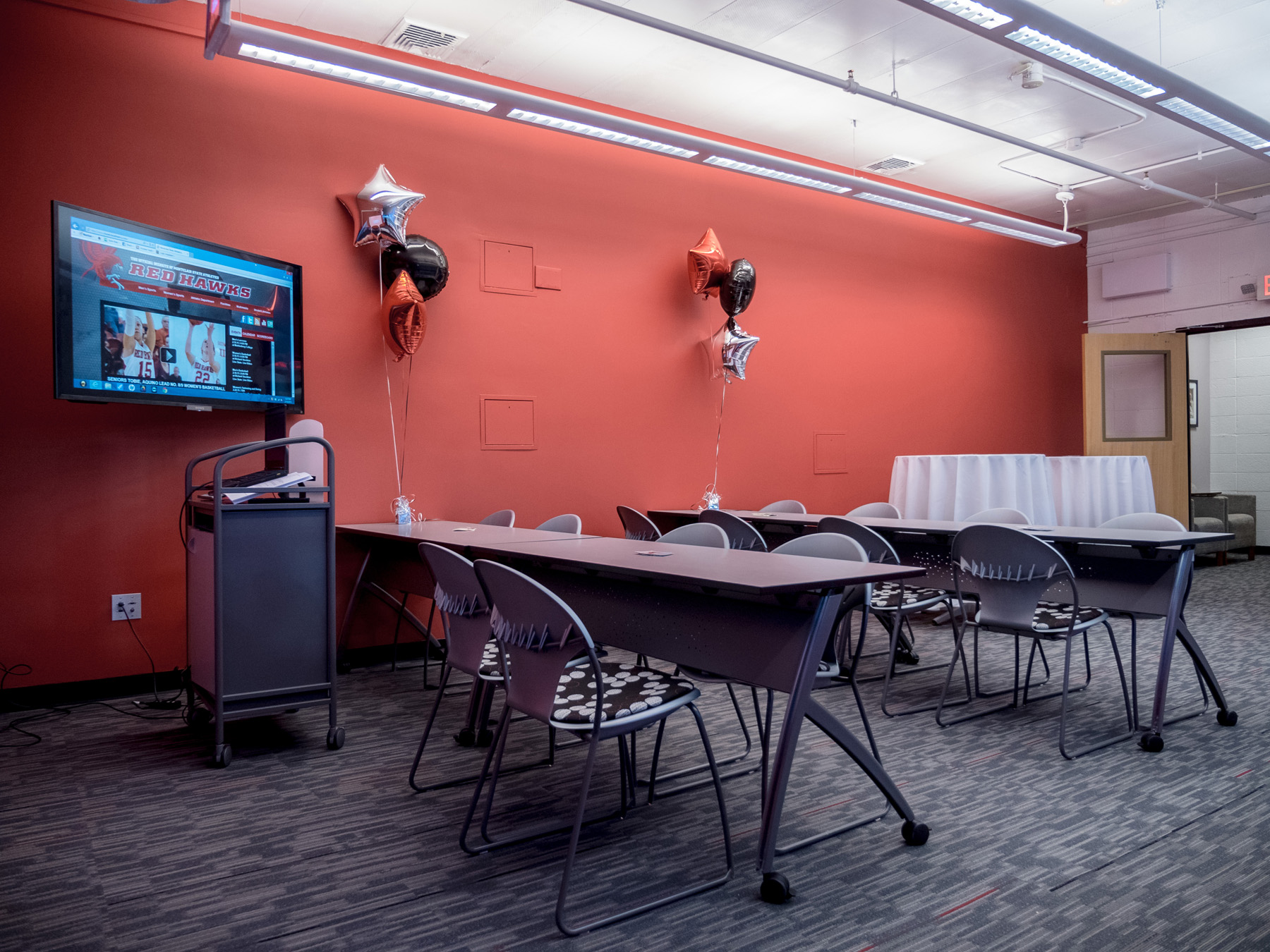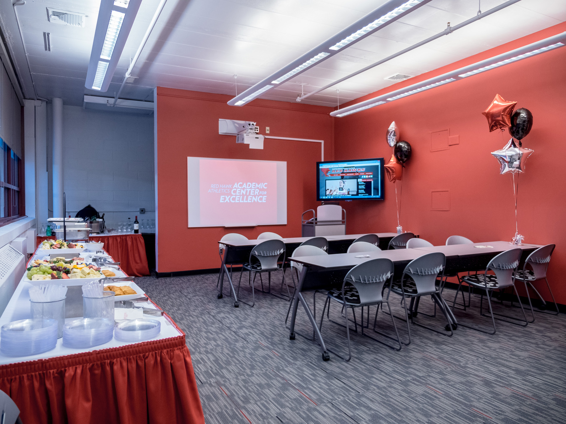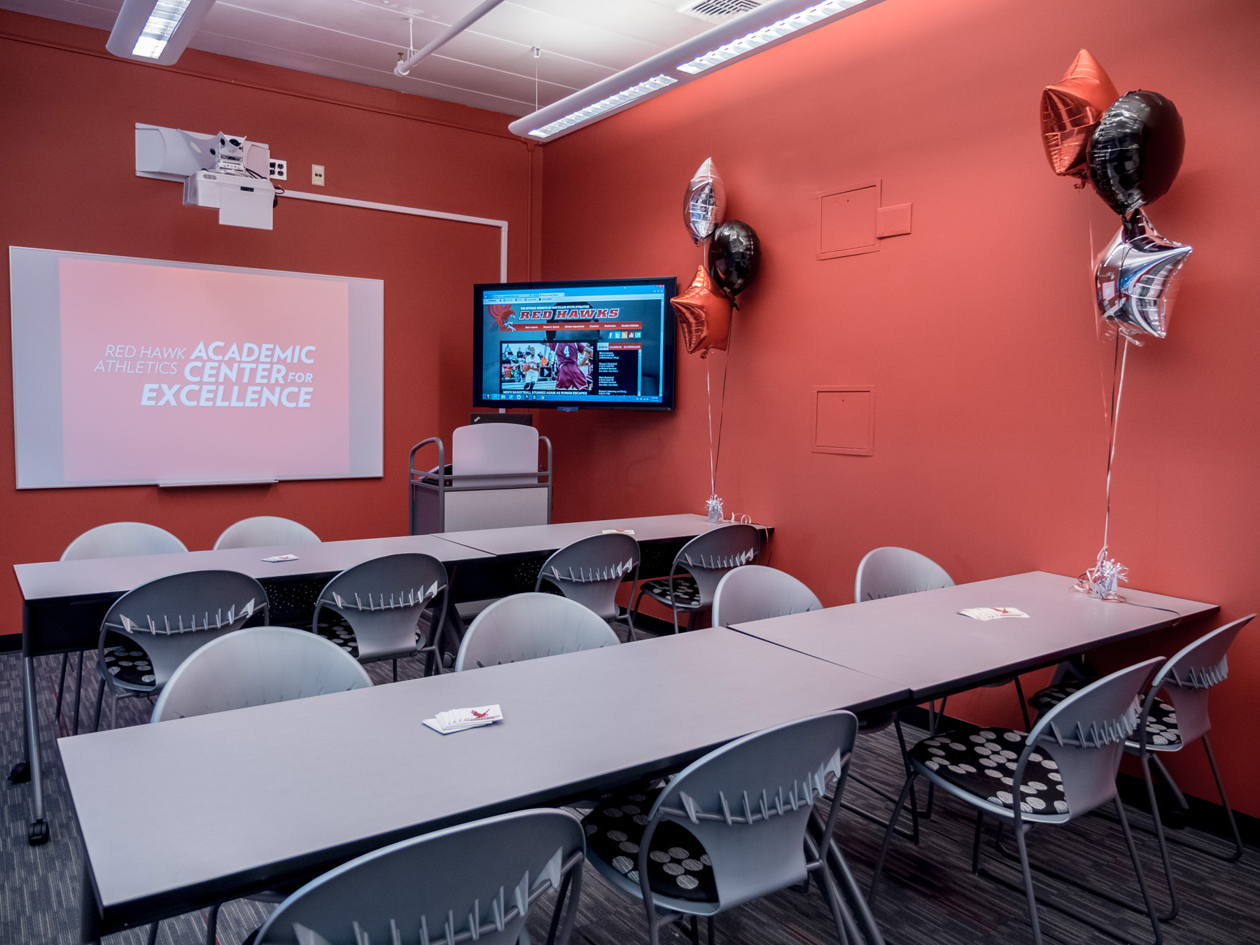 The room is equipped with state-of-the-art technology in a modern design that provides a comfortable and professional working environment where student-athletes can learn and grow in their educational experience.