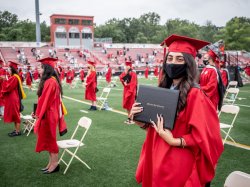 Montclair State University graduates began celebrating a delayed but much anticipated Commencement over 21 small, separate, in-person ceremonies – replete with proper safety measures – starting Saturday, July 18 at Sprague Field on the University campus.