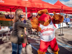 Montclair State University President Susan A. Cole and mascot Rocky welcomed Congresswoman Mikie Sherrill (NJ-11) for a visit to the University’s on-campus flu shot clinic on October 8.