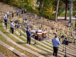 University Amphitheater sets stage for brass musicians recording annual holiday show.