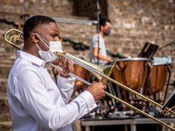 With the pandemic preventing live indoor performances, the brass and percussion musicians spread out over 30 rows of steps decked out with garland and lights, the natural open space and social distancing part of a careful performance comeback for the prestigious orchestra.