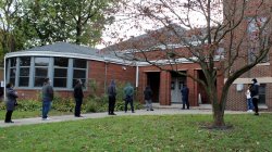 UNION CITY, Nov. 3, 2020: Voters line up to drop off their ballots at the Blue Flame pizzeria. The back of the pizzeria was a polling location for residents in Ward 1. Credit: Joni Mae De Los Santos/ Montclair State UniversityCLIFTON, Nov. 3, 2020: Handing paperwork through a window at the Clifton Municipal Building to avoid risk of contracting COVID-19 while voting on Election Day. Credit: Anton Specht/Montclair State UniversityCLIFTON, Nov. 3, 2020: A Passaic County resident places a ballot into the drop box at the Clifton Municipal Building on Election Day. Credit: Anton Specht/Montclair State UniversityCLIFTON, Nov. 3, 2020: Voters wait their turn outside Elementary School 9 in Clifton on Election Day. Credit: Chad Morrison/Montclair State UniversityMONTCLAIR, Nov. 3. 2020: On Election Day, residents fill out their ballots at Nishuane Elementary School, one of eight polling places in the town. Credit: Joni Mae De Los Santos/Montclair State UniversityMontclair, Nov. 3, 2020: A voter waits inside the polling center at Edgemont School. Credit: Kalimah White/Montclair State UniversityMONTCLAIR, Nov. 3, 2020: Residents fill out their ballots at the Montclair Municipal Building. Credit: Kalimah White /Montclair State UniversityTITUSVILLE, Nov. 1, 2020: Jim Worthington of the People4Trump organization leads Trump supporters in a march across the General Washington Memorial Bridge at Washington Crossing State Park in honor of George Washington’s crossing of the Delaware and in support of reelecting President Trump. Credit: Drew Mumich /Montclair State UniversityWASHINGTON TOWNSHIP, Nov. 3, 2020: A crowd watches the election results at the Italian Affair restaurant in Washington Twp. Credit: Gabby Tancredi/Montclair State University