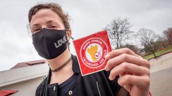 The stickers – which read “Hawk Check – I’m Checked. Are You?” – are being distributed by masked-up student Community Health Ambassadors who have been walking around campus, reinforcing good social distancing, the proper use of face coverings and other safety measures since August.