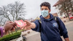 Community Health Ambassador Manny Wheagar distributes Hawk Check stickers – and promotes COVID-19 prevention behavior – to students and staff on campus.