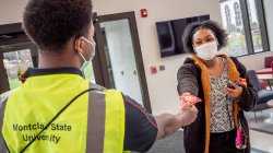 To reinforce Hawk Check usage, each of the approximately two dozen Community Health Ambassadors is now armed with 100 Hawk Check stickers for anyone who performs their daily Hawk Check. Other giveaway items include phone sanitizer and Montclair State-branded face masks. In addition, Hawk Check display stands are posted in key campus locations, including Red Hawk Central in College Hall, the Student Center and the Recreation Center, and permanent affixed Hawk Check signage greets visitors at campus entrances, parking garages and attractions.