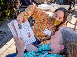 During the in-person visit outdoors in the garden, the students presented customized recipe books. “John joyfully approved of his childhood foods that we included, kielbasa and pierogies,” Carmona says.