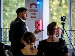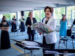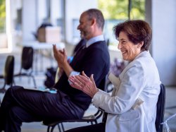The Montclair State University Singers recently surprised retiring President Susan A. Cole with a farewell concert in the Red Hawk parking deck. A tribute to her 23 years of leadership, it was also the first choral concert performed for a live audience on campus in more than a year.