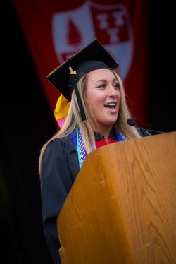 “This past year has given us challenges that we could have never imagined,” Migliaccio told her fellow School of Nursing graduates. “The endless days fighting a disease that we knew nothing about and the feeling of hopelessness as we watched so many lives pass away.”