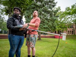 Montclair High School rising sophomore Leland Rogers and Earth and Environmental Studies Adjunct Professor Mike Ayers, use a magnetometer to discover subsurface objects on the Quad. “They are doing geophysical surveys,” says Ayers. “Last week we used radio waves to reflect off of objects. We’ve basically been investigating the way they’ve developed campus. These surveys are very, very popular in industrial uses and construction settings.”