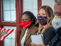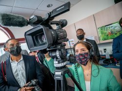 The group spent time with children in two classrooms and held a roundtable discussion with educators as part of their midday visit, which was open only to the news media, including representatives from the University’s student media organizations.