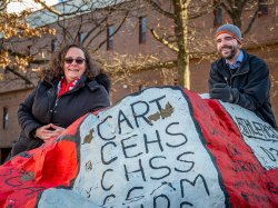Collaborating on a geological survey with Anthony Mennuti, Facilities information manager, Fleming set out to catalog 283 rocks that have been painted by campus groups and the ones still available to claim. Mennuti built the digital tool called “Rock Map,” which allows users to search for rocks by organization, to find “available rocks” to paint, and provides descriptions and photos of specific rocks.