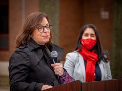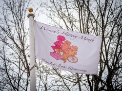 “As I think about all that women are and all that we do, it is incredible,” said Office for Social Justice and Diversity Director Adela Caceres during a flag raising ceremony, the first in a series of special events planned at Montclair State University to honor the contributions of women through history.