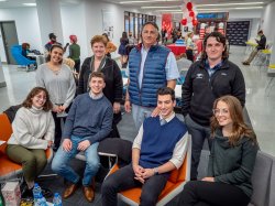 Victoria Povolo, seated right, a sophomore double major in Biochemistry and Italian, says she has a “built-in friend group” coming to Montclair with her four siblings. “So it’s a party everywhere you go.” Joining her at the movie-themed reception (seated from left) are Ashley Povolo, Ludovico Povolo and Marcus Povolo; standing from left, Luisa Bicalho, her parents Silvia and Paolo Povolo, and Hunter Rovere.