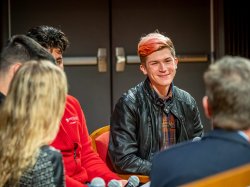 Kaya Maciak, a senior Communication and Media Arts major, co-hosts The College Tour premiere. “I can probably say that all of us who were ambassadors on this, we can check acting now because this is our movie.”A look from behind the scenes with Broadcast and Media Operations, which ran the livestream, directed by University Videographer Christo Apostolou ’17, with School of Communication and Media graduate Jonathan Padilla ’20 and current students Mike Banovic, Gabby Taylor, James Lynch, Jared Stock and Daniela Jimenez Valdez.Co-hosts – Joseph Brennan, vice president for Communications and Marketing, and seniors Kaya Maciak and Jack Barteck – react to the audience during an interview segment with Sienna Grant Mitsak and Jennifer Burlage.In his segment, Anthony Gachetti, a junior studying Earth and Environmental Science in the combined Bachelor’s/Master of Arts in Teaching program, describes what he’s learned giving campus tours as an ambassador.