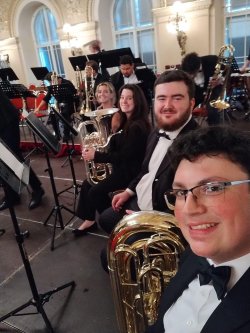 The trip also included an evening concert at the renowned MUTH concert hall in Vienna, Austria. “This is the same hall where the Vienna Boys Choir presents many of their concerts, and the space is magnificent,” McCauley says. “The music we presented there was a bit lighter, and our soloist, faculty member and percussion area coordinator, Barry Centanni, playing two ragtime pieces on xylophone was easily one of the major highlights of the evening.” That piece was arranged by Taylor Goodson, the Cali School’s assistant production manager.