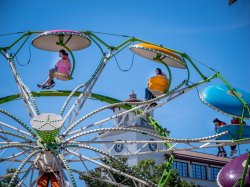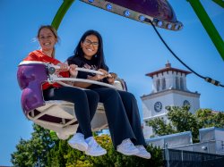 Among returning students enjoying the carnival was senior Music Performance major Maya Henry, who emerged from the Monkey Maze and slid down a circular slide, the only way down from the two-story attraction. She recalled her own Red Hawk Day but says “this was better.”