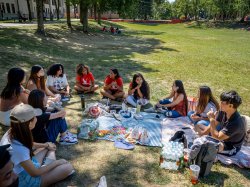 As Red Hawk Day began, friends and first-year Montclair students Victoria Obaniyi, Maria Stathakopoulos, Nicole Martini and Hajeong Lim were among the first to pose for a group photo taken by a professional photographer in front of the giant bronze Red Hawk statue. They’d already bonded after meeting on campus during student orientation. Three of them are New Jersey natives and commuter students who say they are excited about their first school year at Montclair but perhaps the most enthusiastic was Lim, who hails from South Korea.