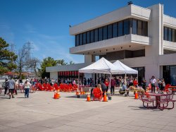 Under the tent nearby, the miniature horses, which are used for equine-assisted therapy to help people of all ages reduce stress and anxiety, as well as assist with social and emotional learning, were unfazed by all of the attention. They especially enjoyed the petting and scratching from their admirers. The minis are shedding their winter coats, so many students left with lots of horse hair on their clothing, which they didn’t seem to mind. They also left with beaming smiles. Even the student, who rubbed her hands together and turned to her friends as they made their way off the patio: “OK, can we go wash our hands now?”