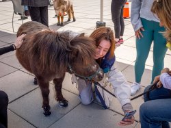 Friends Meghan Redfern and Aniella Martin waited almost an hour for their turn to meet, pet and pose for photos with the ever-popular Alexander the Great and Ravi, two miniature horses brought to the Montclair State University campus to help students de-stress on Monday, April 10.