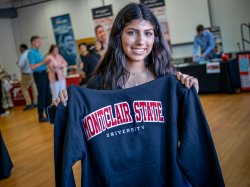 A smiling female student holds up a Montclair State University sweatshirt.
