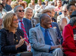 The ceremony was held outdoors in front of the former Science Hall and home of the Department of Biology, the late afternoon setting highlighting both the quintessential beauty of Montclair’s campus and Irvin D. Reid’s numerous contributions to student success during his eight-year tenure as Montclair’s president.