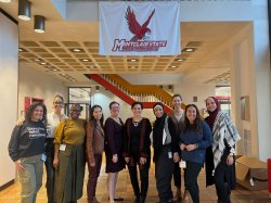 Nine students and a professor stand under a Montclair State University banner with Red Hawk displayed.