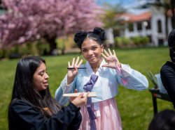 Against the colorful backdrop of the Alumni Green, its park-like setting framed by pink cherry blossoms and blue skies, the campus was alive with flavors, sounds and languages from around the world. Children with their faces painted and students in the ubiquitous Montclair red played games, won prizes and sampled international foods (and even waters of the world) among the winding pathways in front of Cole Hall.