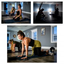 In these photos, she moves through table-top and Cat-Cow postures – practices she says are especially helpful for maintaining spinal mobility as we age. Sitting just behind her is Bertram, her outspoken dachshund mix and loyal studio companion.