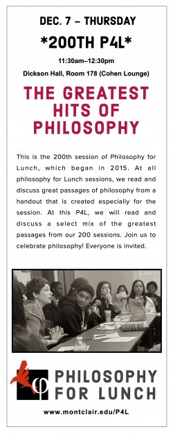 - Description: This is the 200th session of Philosophy for Lunch, which began in 2015. At all philosophy for Lunch sessions, we read and discuss great passages of philosophy from a handout that is created especially for the session. At this P4L, we will read and discuss a select mix of the greatest passages from our 200 sessions. Join us to celebrate philosophy! Everyone is invited.