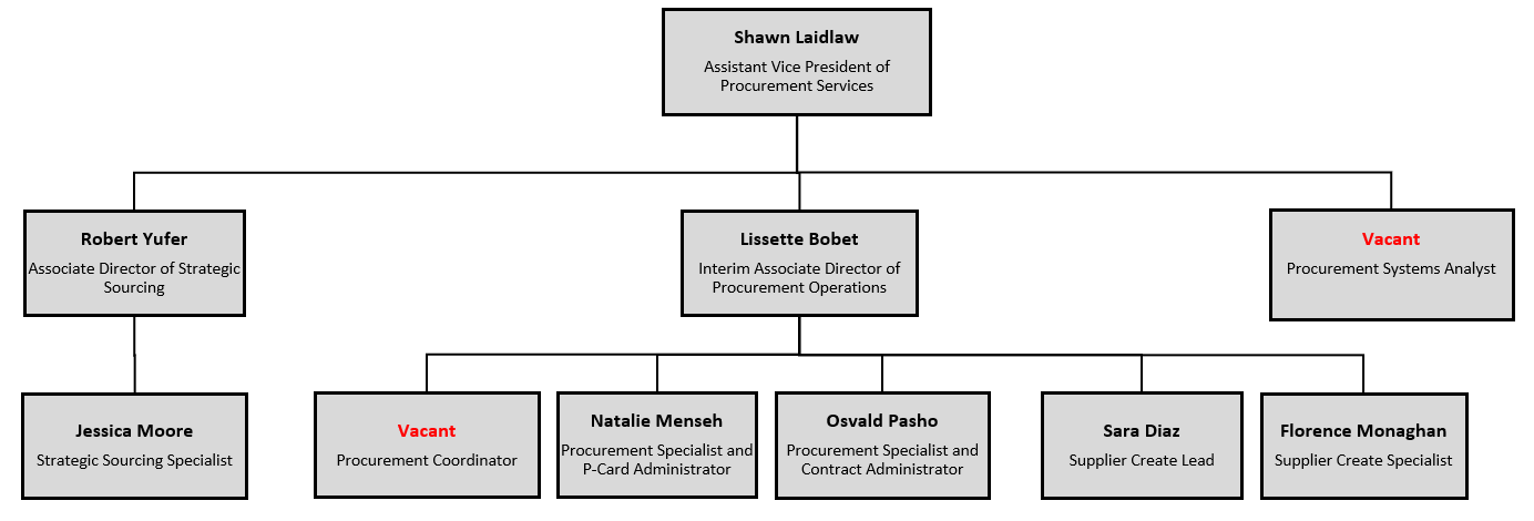 - Provides managerial and administrative support in all phases of the University’s procurement operations including requisitions, contracts, waivers of advertising, P-Cards, suppler database, and compliance-related processes