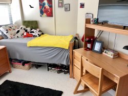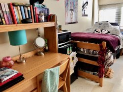 One side of a double room in Blanton Hall with a bed and desk decorated by a student.