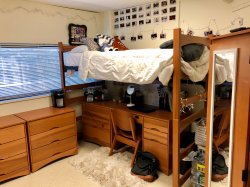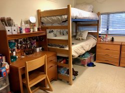 Another side of the room in a Triple in Blanton Hall with a bunk bed and a desk underneath.