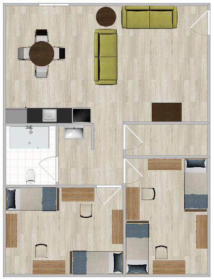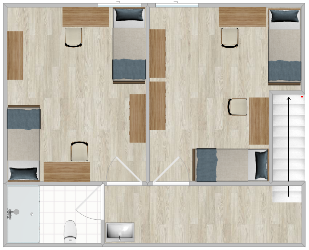 - B, C apartments – 2-floor apartments (kitchen/living room on 2nd floor, bedrooms/bathroom on 3rd floor)