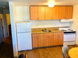 Another angle of a Hawk Crossings kitchen showing off the stove, counter space and fridge.
