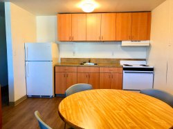 Another view of the kitchen in a Hawk Crossings apartment with a kitchen table and chairs as well as a fridge and stove.