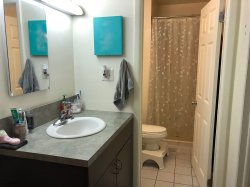 A bathroom in a multi-floor Hawk Crossings apartment showing the vanity and sink outside and the toilet and shower behind a door.