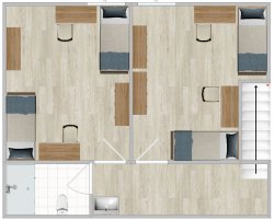 A Hawk Crossings Double upstairs area featuring two bedrooms and a bathroom with a shared foyer.