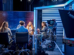 Under the direction of enthusiastic faculty with decades of classroom, agency, brand and media production experience, each entity mirrors a professional setting and is equivalent to an internship. Making SCM distinct from other programs is an orchestrated effort called the Coordination Desk, which each week brings together students from the radio station (WSMC), newspaper (The Montclarion), news station (News Lab), sports network (Red Hawk Sports Network) and agency (Hawk Communications) to share best practices, story ideas and key learnings.
