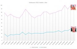 - Social Media users also enthusiastically shared their intention to dress as Barbie or Ken. Users gushed about the excitement of creating a “pink utopia” for this Halloween, which was specifically associated with key words such as “ridiculously fun,” “spirit,” “family-friendly,” “Barbieland,” “neighborhood coordination,” etc. With 48% of the conversation being contributed by males, there was excitement and sarcasm surrounding those dressing up as Ken.