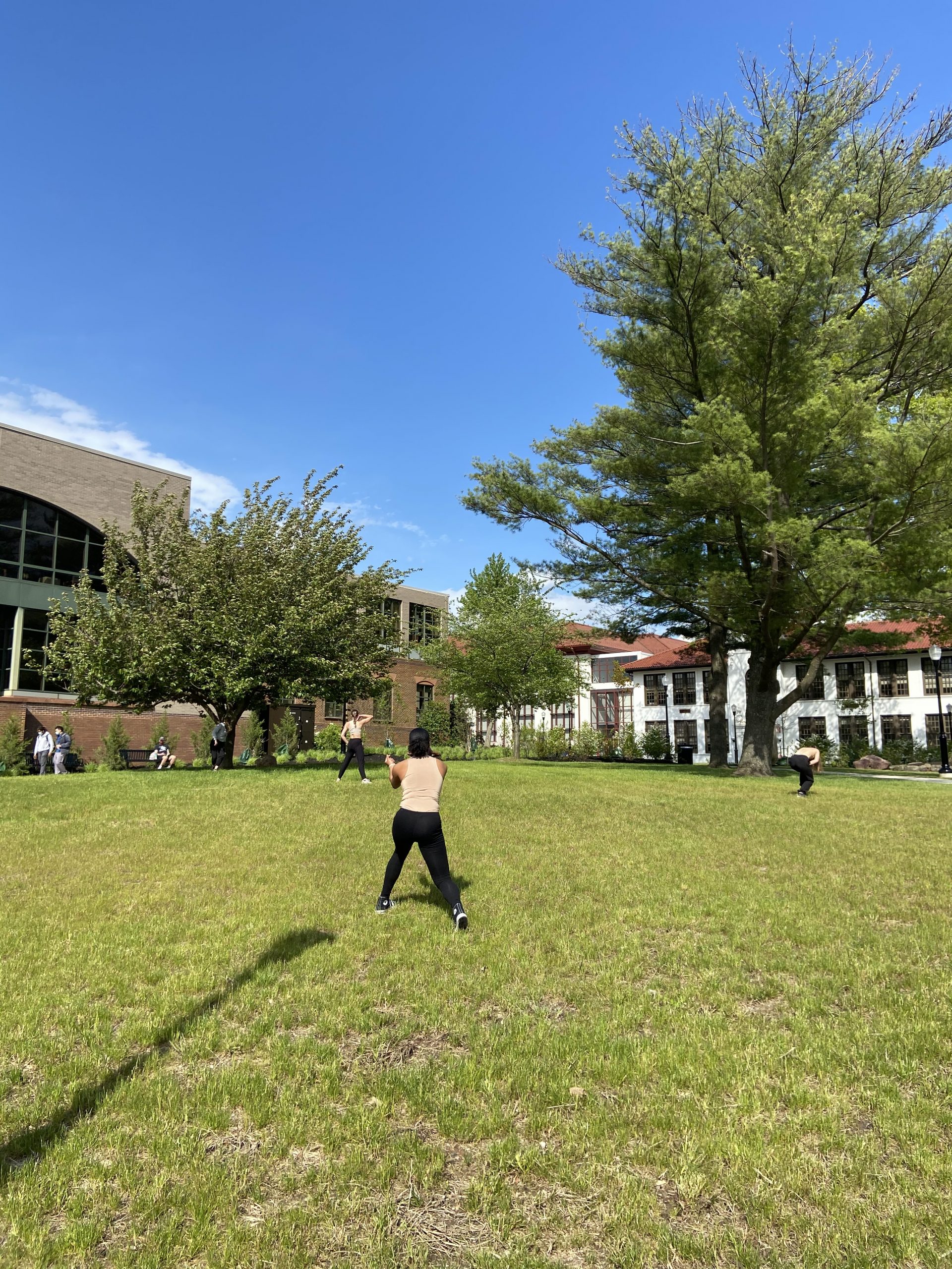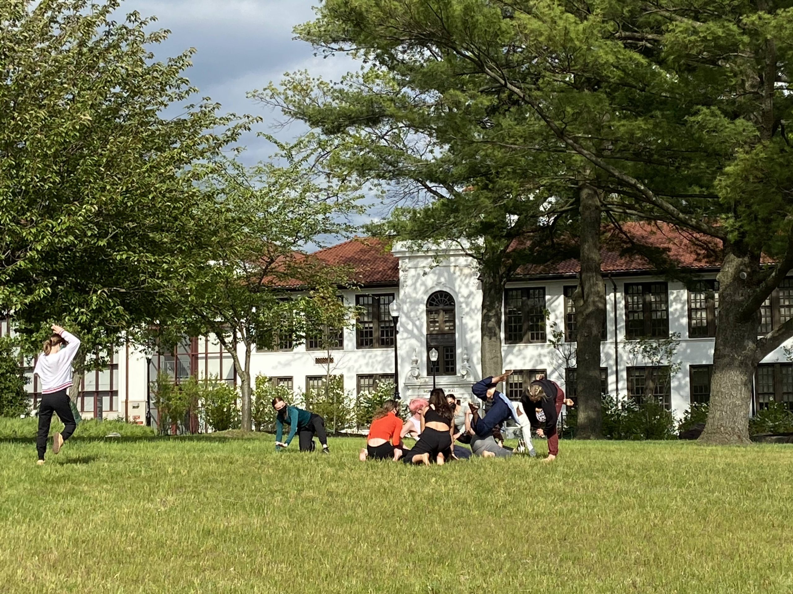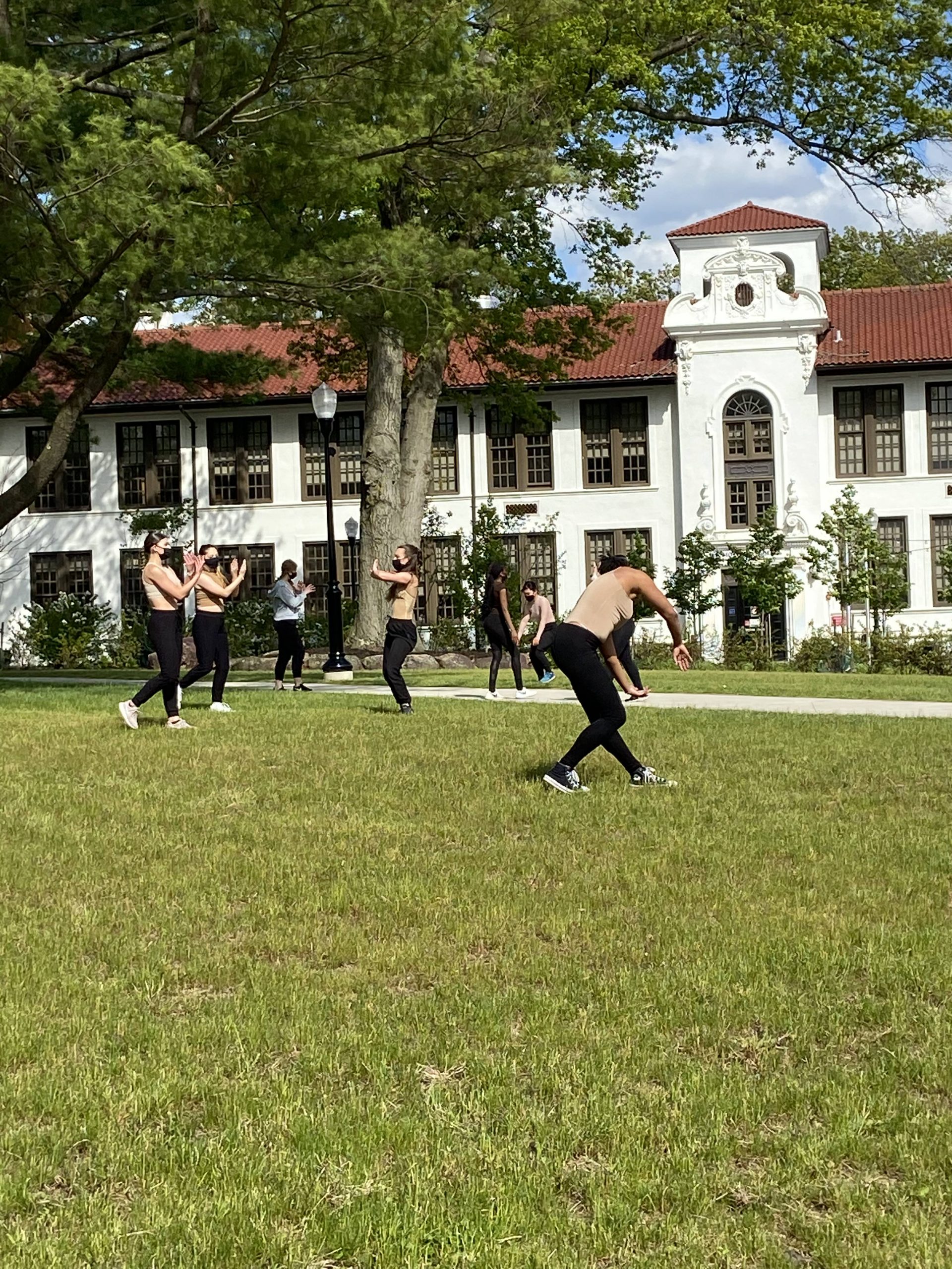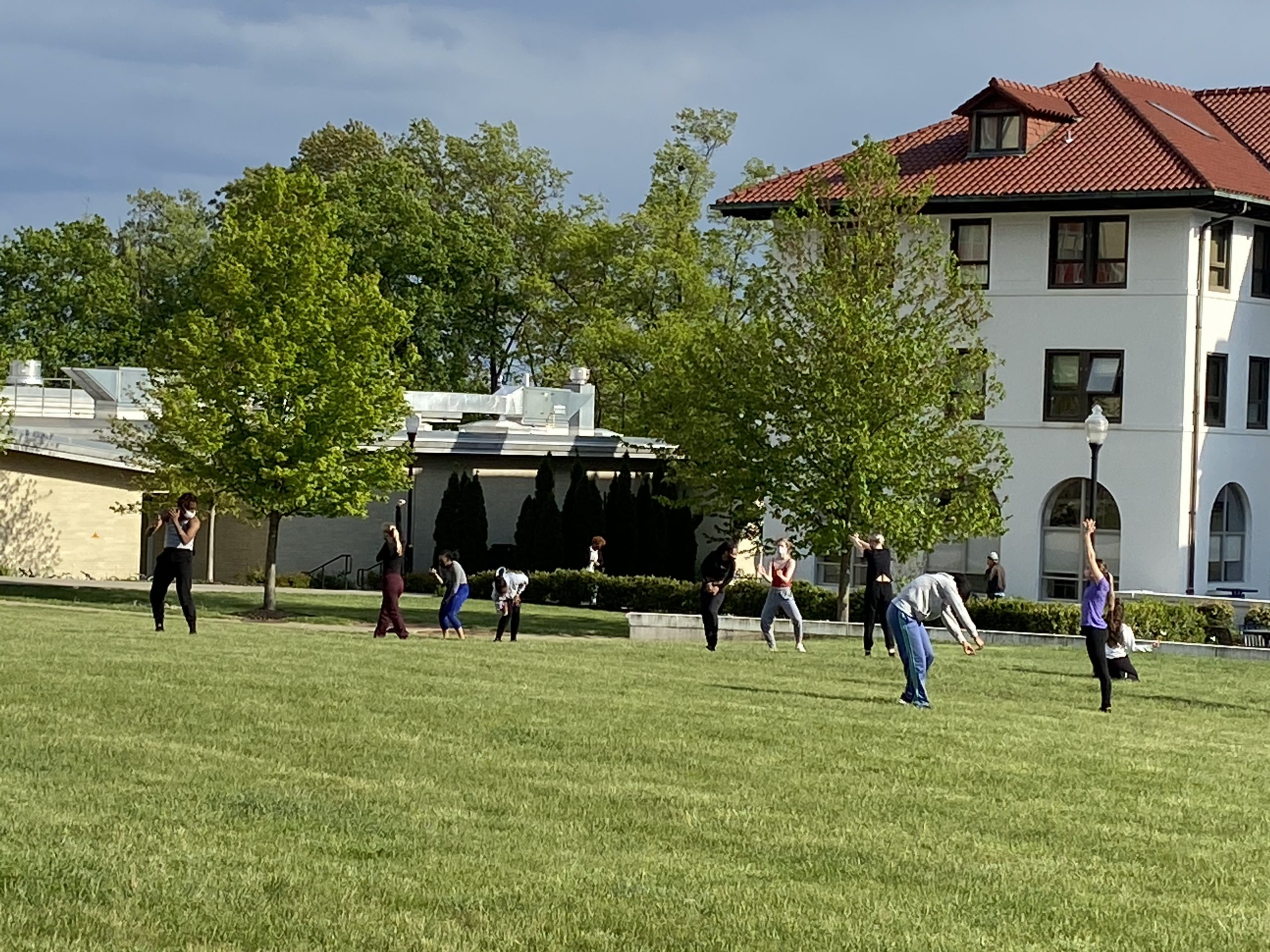 Christian Von Howard, Faculty and the curator of this event scouted and confirmed the site locations on campus and created a music playlist inspired by the music used by the guest choreographers from the Spring Dance Concert. Dancers were supplied the playlist to prepare themselves before the event–ready with the knowledge that the music would be playing randomly throughout the locations during the event. Lightweight costumes were selected by the dancers, many of them elected to wear clothing similar to the costumes selected by their choreographer, while others picked apparel conducive to spontaneous, outdoor movements.