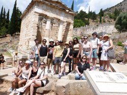 In late June and July, Theatre and Dance faculty members Jessica Brater, Mark Hardy, and Randy Mugleston were in residence in Athens, Greece along with 18 of their students. For 4 weeks, they studied ancient Greek drama and visited important historic sites in the birthplace of Western theatre traditions. Their adventures took them from the islands to the mountains around the site of the ancient oracle at Delphi to the ruins of the city of Mycenae, home to the Agamemnon story. Each day in Athens they studied in sight of the Acropolis and the Parthenon. It was an immersion in contemporary Greek culture and art as well. The group was hosted by the Hellenic American University campus in Athens.